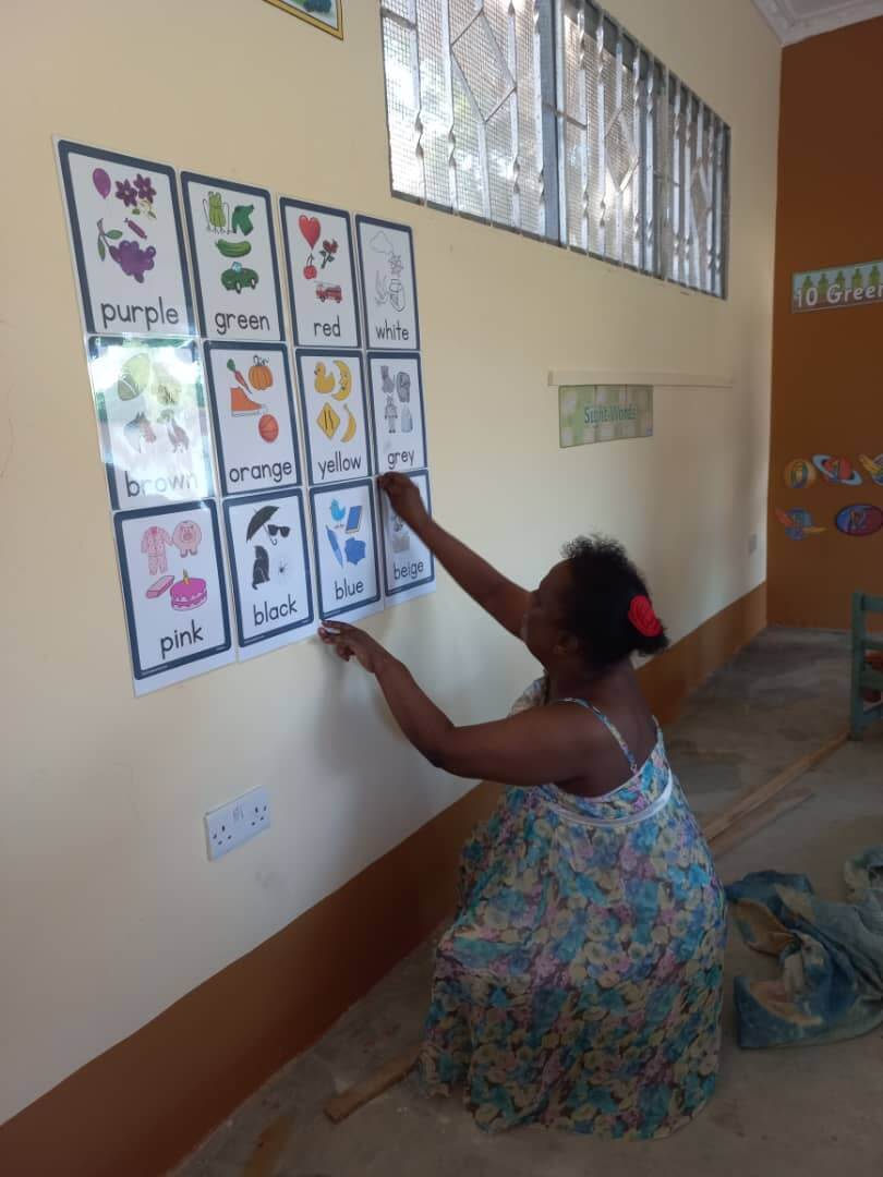 La maitresse colle des affichettes pour apprendre les couleurs à travers des objets